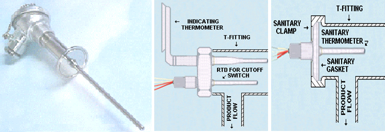 The temperature sensors are installed in a fitting at the outlet of the heating and or cooling system with and or without the use of a sanitary flange. These sensors have been mercury column thermometers in the past, but are now being replaced by high accuracy resistance temperature detectors (RTD's).